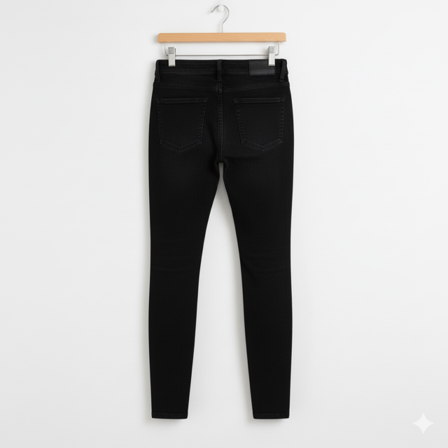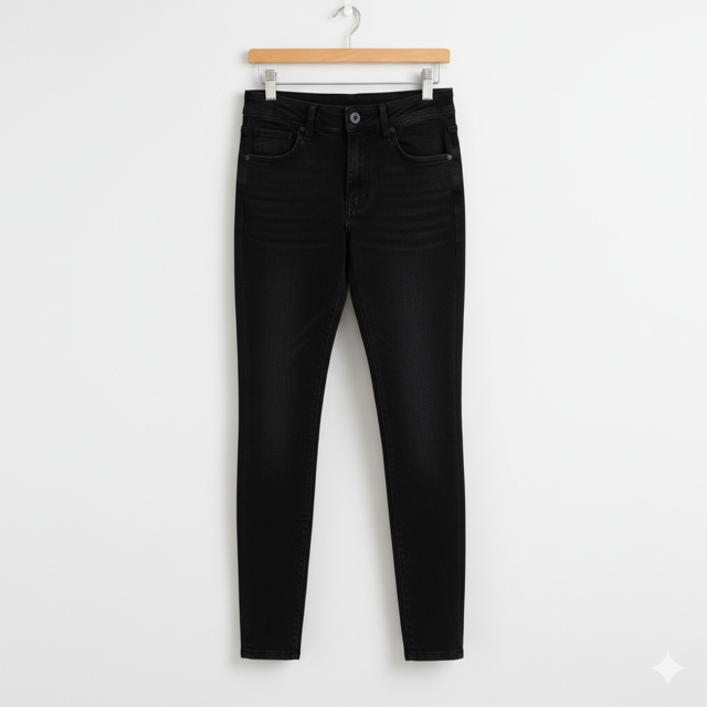 Stretch denim, high-rise, skinny tapered, modern trendy. Made in India.