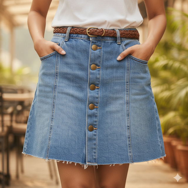 Cotton denim, short length, button front, trendy. Made in India.