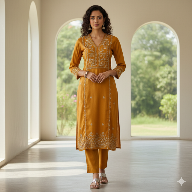 Silk blend (240 GSM), embroidered, kurta with matching pants. Made in India.